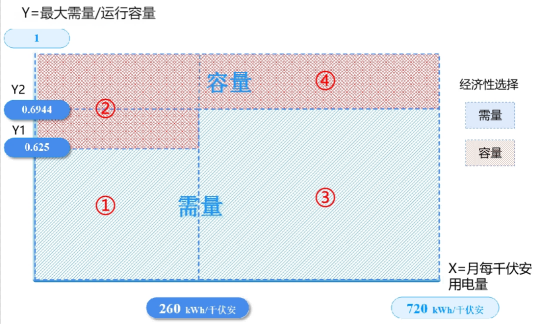 当每月每千伏安用电量大于等于260千瓦时,若每月实际最大需量低于运行容量的0.6944时,选择需量电价更经济(如图区域③),否则容量电价更经济(如图区域④)。